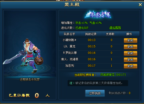 玩家每次挑战成功击杀BOSS后均会有一个击杀BOSS时间记录,第二天按照之前的BOSS击杀时间记录,记录保持着获得BOSS对应BUFF加成;