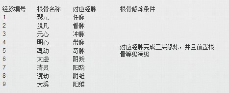1.9大经脉对应9大根骨,修炼完一条经脉即可在前置根骨已满级的条件下进行其对应根骨的等级提升;