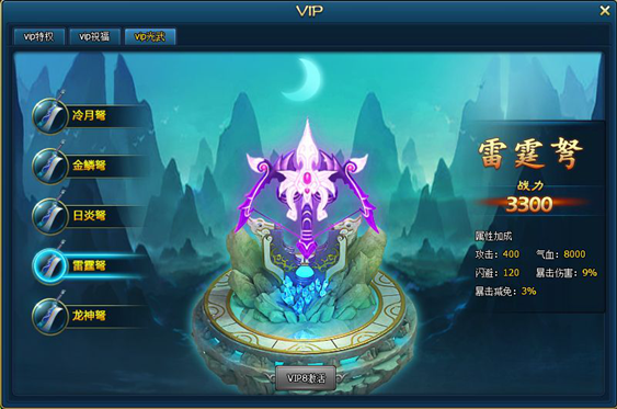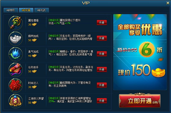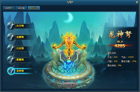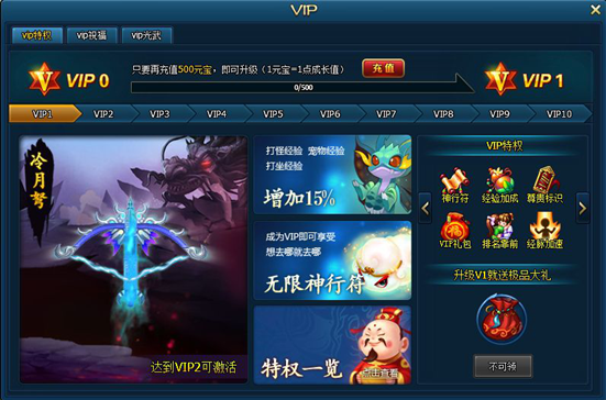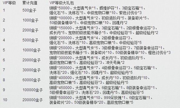 活动内容:开服后,充值金子可以提升VIP等级,不同VIP等级不仅可以领取超炫光武武器以及VIP等级大礼包,还可以享受各种VIP等级特权和VIP祝福福利哦!