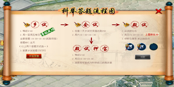 4. 答题活动将奖励大量经验,会试殿试排名前50还有额外奖励,万不可错过。